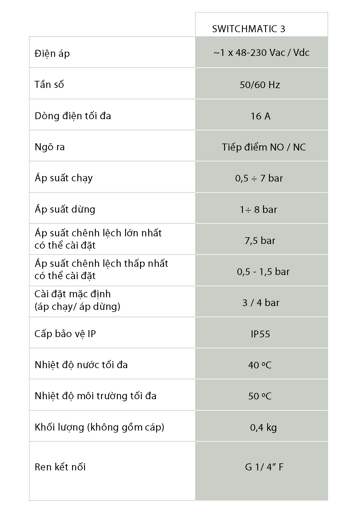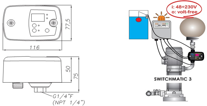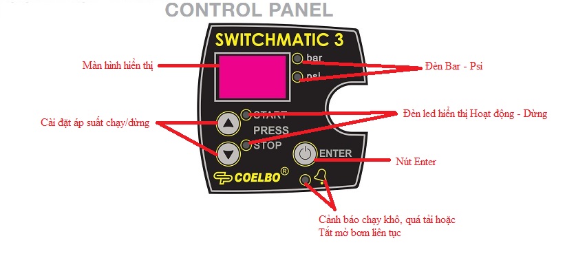 - Sử dụng kết hợp với tủ điện để điều khiển hệ thống bơm. - Chức năng ART (Tự động reset), khi SWITCHMATIC dừng máy bơm do tính năng bảo vệ máy bơm không chạy khô - do không có nước cấp, sau một khoảng thời gian nhất định, nếu nguồn nước cấp cho máy bơm được phục hồi, SWITCHMATIC sẽ tiếp tục điều khiển máy bơm hoạt động tiếp tục. - Chế độ Sleep - khi không sử dụng để tiết kiệm điện. - Tích hợp cảm biến áp suất. - Tích hợp Đồng hồ áp suất (Tùy chọn đơn vị Bar hay Psi). - Giao diện dễ sử dụng: hiển thị thông số với màn hình 3 chữ số, đèn led trạng thái và nút nhấn. - Có thể Tắt mở máy bơm bằng nút nhấn trên màn hình Switchmatic. - Chế độ hoạt động: Tắt mở máy bơm theo áp suất cài đặt (Tiếp điểm đóng mở có thể tùy chỉnh: tiếp điểm thường mở - NO hay thường đóng - NC). - Đáp ứng các tiêu chuẩn EMC và An toàn điện. - Đáp ứng các tiêu chuẩn RoHS và WEEE.Thông Số