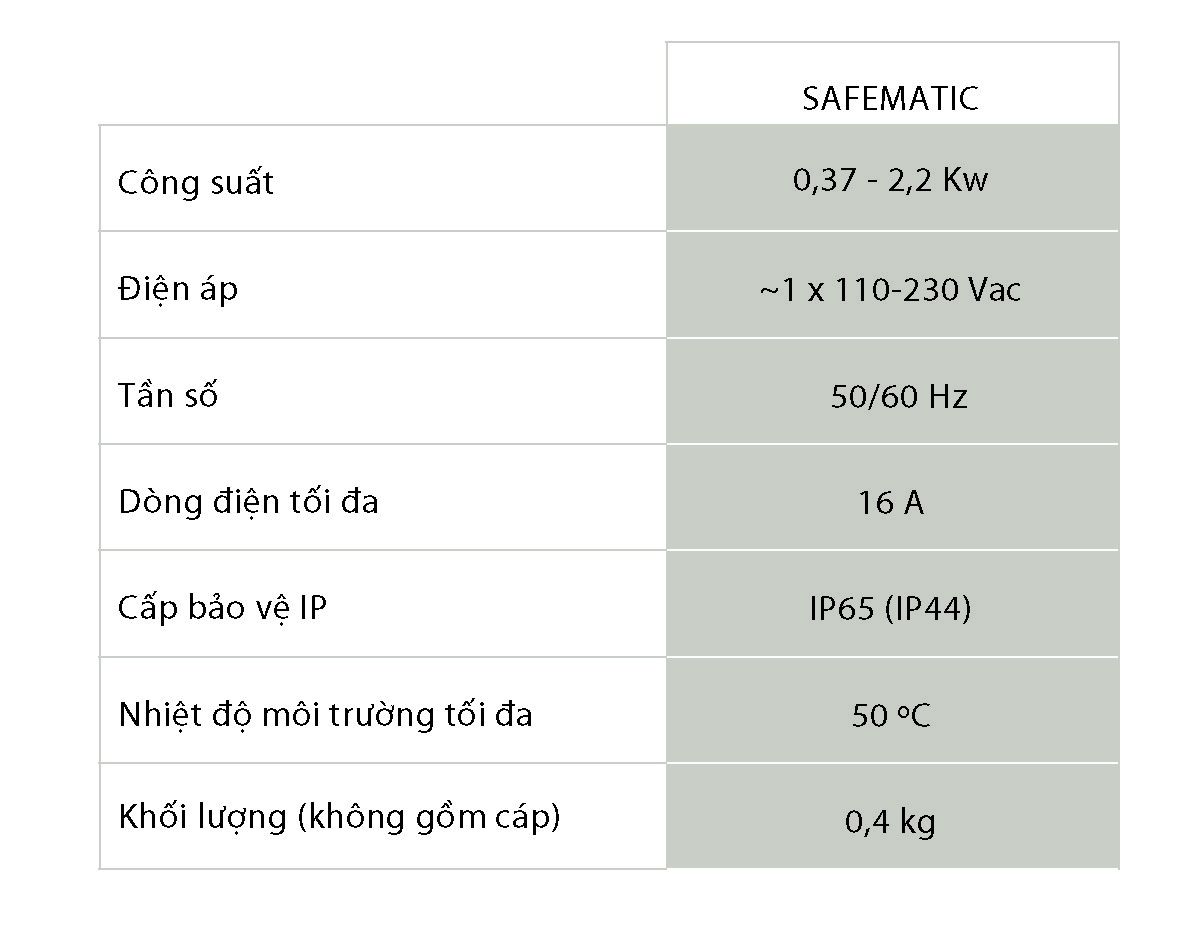 - Bảo vệ bơm không chạy khô. - Bảo vệ bơm quá tải. - Chức năng ART (Tự động Reset). Khi Safematic dừng máy bơm do tính năng bảo vệ bơm không chạy khô - do không có nước cấp, sau một khoảng thời gian nhất định, nếu nguồn nước cấp cho máy bơm được phục hồi, Safematic sẽ tiếp tục điều khiển bơm hoạt động. - Tính năng ngăn ngừa Tắt / Mở máy bơm liên tục: khi bình tích áp bị giảm áp suất và Máy bơm tắt mở liên tục thì Safematic sẽ cảnh báo. - Có thể Tắt / Mở máy bơm bằng nút nhấn trên Safematic. - Hệ thống đèn Led cảnh báo lỗi: Failure, Nguồn và Bơm chạy. - Tích hợp sẵn ổ cắm nguồn cho Bơm. - Loại treo tường cố định có dây cấp nguồn đi kèm. Hoặc loại ghim thẳng trực tiếp vào ổ cắm điện - Đáp ứng các tiêu chuẩn EMC và An toàn điện. - Đáp ứng các tiêu chuẩn RoHS và WEEE.Thông Số