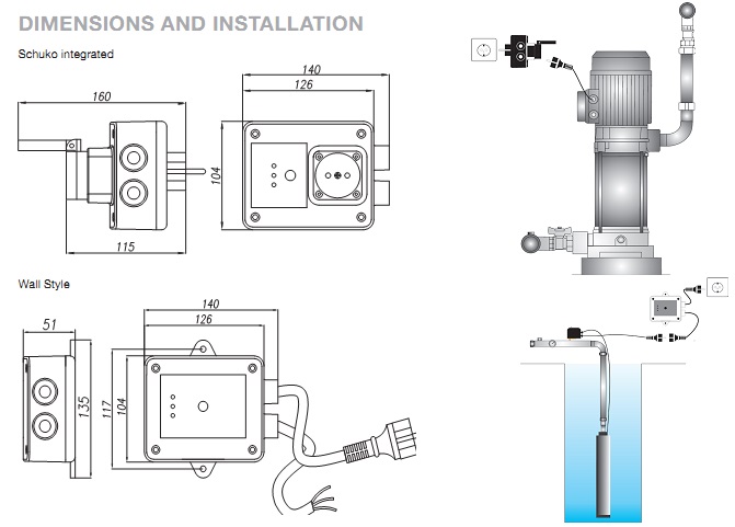 Thiết bị bảo vệ bơm khi phát hiện Bơm chạy khô hoặc quá tải. Loại treo tường cố định có dây điện cấp nguồn đi kèm. Hoặc có thêm một lựa chọn là loại ghim thẳng trực tiếp vào ổ cắm điện.
